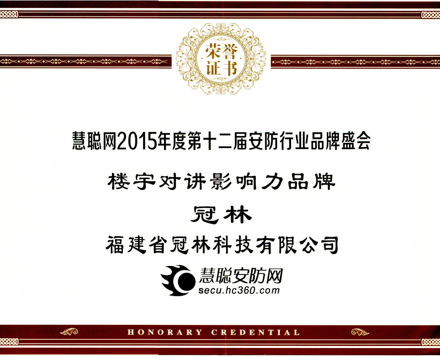 2015第十二屆中國安防高峰論壇暨行業品牌盛會頒獎典禮上,冠林憑借著在廣大消費者當中良好的口碑以及強大的品牌影響力從幾百家企業中脫穎而出,成功榮獲“樓宇對講影響力品牌獎”。
