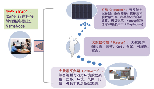具體在大數(shù)據(jù)采集端,根據(jù)實際需求,提供集綜合視頻與動力環(huán)境采集于一體的、可以分布式部署的綜合采集設備,以完成各類綜合信息的有效提取。同時,也將根據(jù)架構的需求,在設備方面賦予一定的智能分析功能。綜合采集設備所提取、處理的各類信息,將通過一線(大數(shù)據(jù)傳輸),在保證安全可靠的情況下完成大數(shù)據(jù)混合處理,傳輸?shù)胶蠖恕T诤蠖耍瑢A繑?shù)據(jù)開展匯聚、分類、管理、加工等工作。最后,通過iCAP平臺,為各類用戶提供滿足信息、結論、及時、簡單、智能五大核心需求的服務。