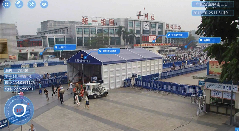 “增強(qiáng)現(xiàn)實(shí)”在攝像機(jī)領(lǐng)域是一個(gè)全新的概念,普通攝像機(jī)反映的是“現(xiàn)實(shí)”,這種現(xiàn)實(shí)由于缺少附加性的信息,給監(jiān)控畫面的安保人員帶來了極大的困惑。為了解決這些問題,需要在“現(xiàn)實(shí)”的基礎(chǔ)上進(jìn)行“增強(qiáng)”,給實(shí)時(shí)監(jiān)控畫面添加名稱、經(jīng)緯度、方位角、距離、位置、歷史案例描述、聯(lián)系方式等等信息,這些輔助能屏幕前的安保人員及時(shí)有效地處理視頻畫面捕捉到的異常、突發(fā)情況。