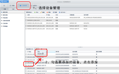 EZStation支持自動搜索所有在線NVR設(shè)備,并快速添加。同時支持自動添加NVR設(shè)備下的攝像機,如果設(shè)備地址遺忘,連接網(wǎng)絡(luò),搜索成功后即可直接修改。除此之外,EZStation還能統(tǒng)一管理流媒體服務(wù)器、解碼器等。