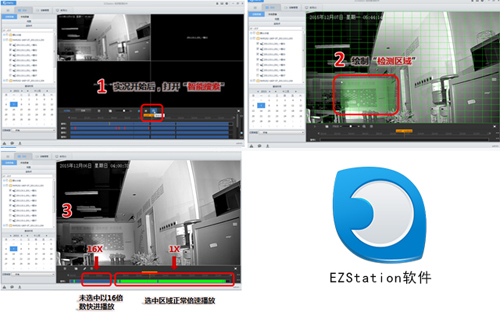 海量數(shù)據(jù),智能檢索EZStation實現(xiàn)從海量數(shù)據(jù)中快速提取有效數(shù)據(jù),提高檢索效率。使用方式:用戶選定檢索區(qū)域后,系統(tǒng)對選區(qū)內(nèi)的錄像進行智能分析,判斷檢索區(qū)域是否存在物體運動,同時用不同的顏色區(qū)塊標識出來,快速檢索。另外,用戶如需查看特定時段錄像,也可進行選定設(shè)置,非檢索錄像會以16倍數(shù)的快進速度進行回放;符合檢索條件的錄像則會以正常倍數(shù)進行播放。