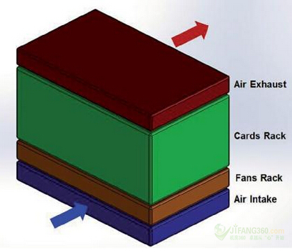 冷卻系統的組織,是為了使其符合機架供應商的標準。如圖1所示,其顯示了我們最終的設計草圖。進氣口是在前端的底部,而空氣的排出口是在頂部的背面或頂部。空氣流是從機架的底部流到頂部。最小空氣流量為每秒0.2立方米(m3/s)或420立方英尺每分鐘(cfm)。這一空氣流被定義了,以便該系統將能夠與現有的卡和機架向后兼容。機架的大小被固定在大約0.4 m x 0.44 m x 0.25 m (H x W x D),這意味著系統中的空氣每秒將被替換約四次。