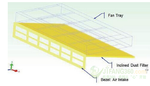 保持過濾器與風扇的平行是一大擁有其主要優勢的選擇:過濾器的提取非常符合人體工程學。我們不得不增加系統高度至25毫米,同時將過濾器的尺寸被限制為系統的深度和寬度。增加表面應減少壓力下降,同時增加維修的次數。使用進氣口對角線來增加表面的空氣進入量。這個概念在空調系統中經常被使用。我們證實了這一定位,如圖3所示,其可以說是最好的模擬。