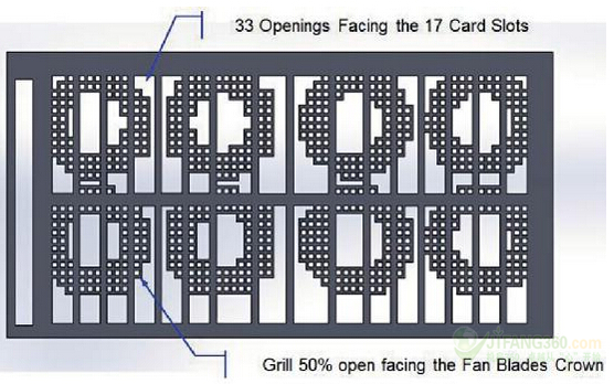 我們創建了一個多孔板,其具有兩個主要功能:1)在沒有插槽的地方停止氣流流動,以避免將空氣吹入封閉的EMI屏蔽物;2)在我們觀察到較高的氣流速度的區域減少氣流流動。這個多孔流體分配板(FDP),如圖9所示,必須是與該EMI屏蔽接觸。其將從而在入口處關閉,由卡機架的另一側已經關閉了蜂窩孔格封閉。因為板不需要維護,它可以連接到EMI屏蔽代替風扇機架。風扇和該多孔板之間的距離是至關重要的。氣流必須能夠被通過開口槽而不產生不可接受的壓力下降。
